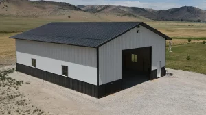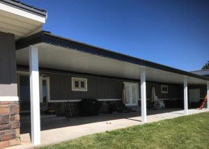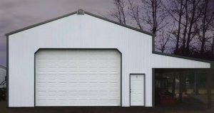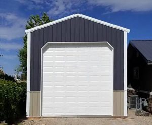 One large garage door with extra covered roof/awning and one man door. Garage, Storage and Workshop.