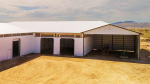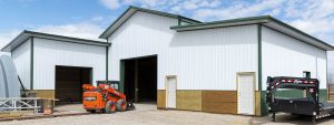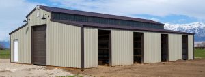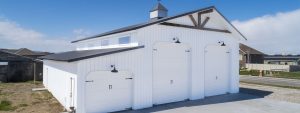 Three front garage doors, two extra tall with another garage door in the back, for drive through access. 4 garage doors and two man doors. Garage, storage and workshop.